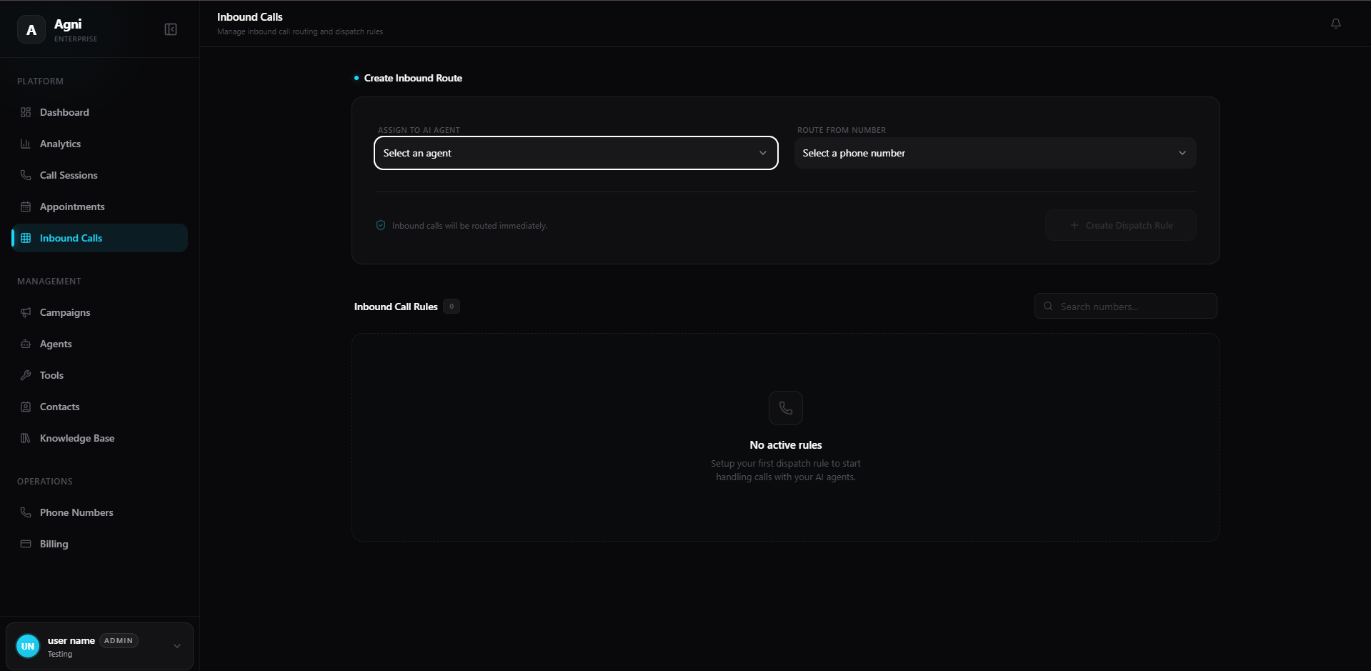 1-to-1 Mapping: Each phone number can only be routed to a single agent at a time. If you need to change the agent handling a number, delete the existing dispatch rule first, then create a new one.
