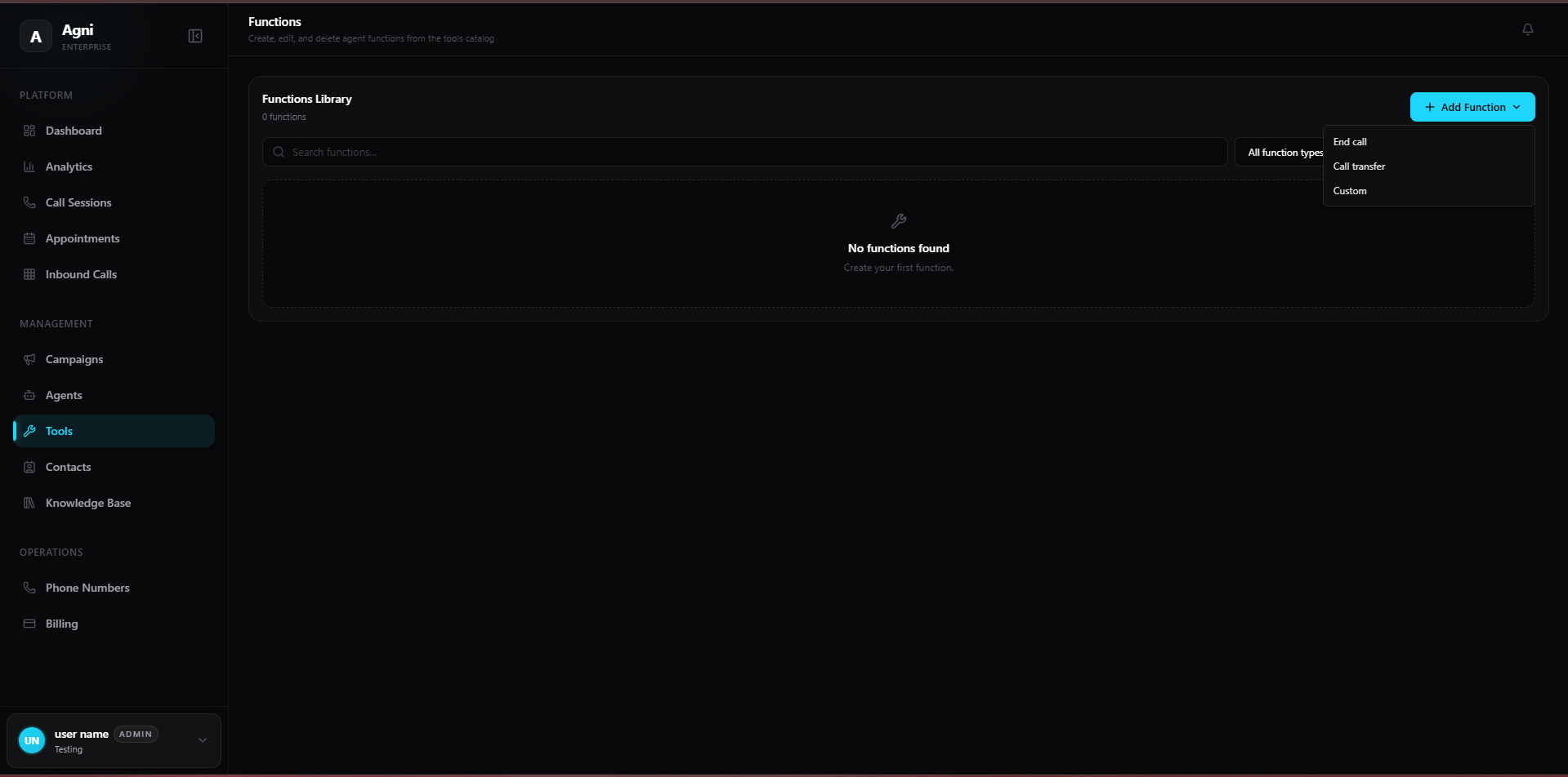 To create a new tool, click the + Add Function button in the top right corner of the Functions Library. Agni supports the following built-in function types: