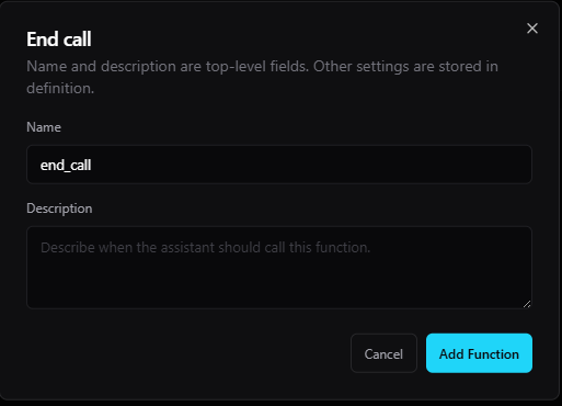 end_call). - Description: A natural-language instruction telling the AI exactly when it should trigger this function.