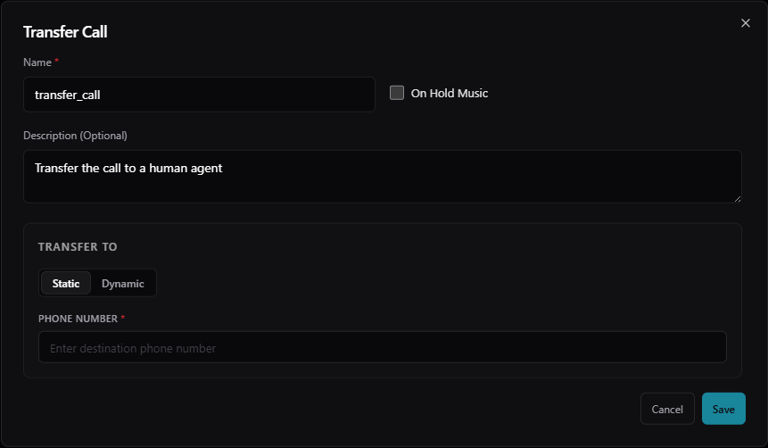 transfer_to_support). - On Hold Music: Toggle this on to play holding music while the transfer connects.